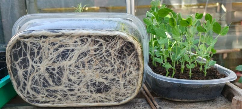 Lijkt mij flauwekul. Voorzaaien doe je omdat je een zaadje een voorsprong wilt geven. Wegens muizen, duiven, slecht weer en verzin zelf nog maar iets 😄 Anders kun je ook gewoon direct in de grond zaaien, want dat doen planten zelf ook. Het voedsel wat in het zaad zit moet inderdaad het ontkiemende plantje op weg helpen, tot het zich zelf kan redden en het moment dat het genoeg is, zoekt dat plantje zelf wel uit. Ik kweek al mijn erwten en peulen voor in alles wat beschikbaar is dus zowel platte bakken of soms diepere. Ik heb bij het uitplanten weinig verschil kunnen bespeuren. Inderdaad is er bij erwten enzo een lange hoofdwortel, zoals de foto van @Patrijs al laat zien.Die zoekt zo snel mogelijk diep zijn weg. Bij ruimtegebrek frummelt die hoofdwortel zich om een hoekje. Ik kweek elk jaar wel iets in de ondiepe bakken van de Chinees. Ziet er zo uit: Geen probleem, goed wateren voor het uitplanten en je trekt het (voorzichtig) zo los. Deze gaan komende week ergens in grotere bakken.