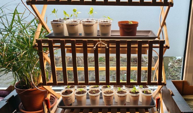 Klopt, één rekje, met vijf plankjes. Ik heb er twee weggeklapt. En als alle plantjes groot genoeg zijn en in mei uitgeplant, dan gaat de boel weer plat gevouwen en opgeborgen tot het volgende jaar 😀