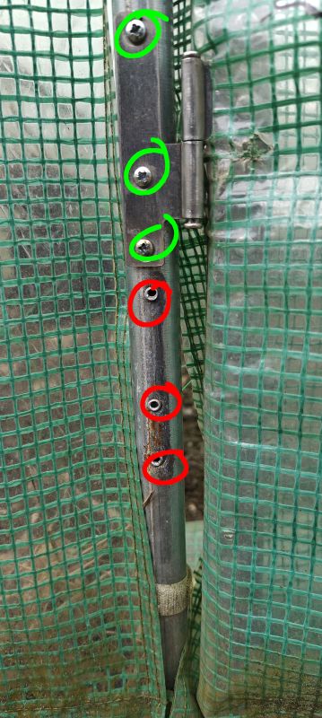 Het is gelúúúkt!!!! Na twee jaar ofzo behelpen met een kasdeur met een verkeerd geplaatste scharnier (de deur hing voor de helft met tie-wraps vast) heb ik eindelijk de klus geklaard! Ik ben blij met mij 🥳 De scharnier zat op de verkeerde plek gepopt. Popnagels van staal zijn lastig uit te boren (weet ik van mijn werk), dus typisch een uitstelklus. Vandaag toch maar boormachine etc. meegenomen. Tuurlijk, bij de laatste popnagel knapt de boor. Kak! Naar de gamma gefietst, nieuwe boortjes gekocht. Nieuwe gaten op de goeie plaats geboord. De schroeven die ik op de tuin heb zijn geen van allen geschikt (verkeerde maat of type, zucht) dus terug naar huis gefietst om in de bakjes te zoeken naar iets wat wel past. Hėhė, klaar 😀 (rood is oud, groen is nieuw) Daarna nog vanalles gezaaid; witte bietjes, spinazie en wortel diversen.