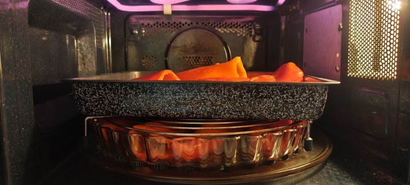 Eèèn ik ben bezig! Eerst maar eens 1 kilo. Het is voor mijn kleine combi- magnetron wel wat passen en meten. De glazen schaal links bleek niet te passen 🤨 dus maar vervangen door een taartschaal. Toen ging het met het eerste hoge rekje wel heel hard qua zwart randje dus maar weer gewisseld met het lage rekje. Zo jammer dat ik geen middel rekje heb want het lage rekje past wel, maar er kan geen warmte tussendoor. Maar gewoon doorgaan 😀 Straks weer even omwisselen.