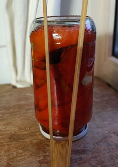 Resultaat! Van 1 kg paprika blijft een pot van 500 gr over. Beste hulp zijn de bamboe knijpers. Oppakken bij de paprika-opening en gebruiken voor stevig aanduwen. Ik gebruik ze trouwens bij alles wat heet is en niet met ovenwanten verplaatst kan worden. Kost niks bij Xenos of Action. Ik had ook een paprika over, dus gelijk opgegeten. Ik denk niet dat deze pot het eind van december gaat halen.
