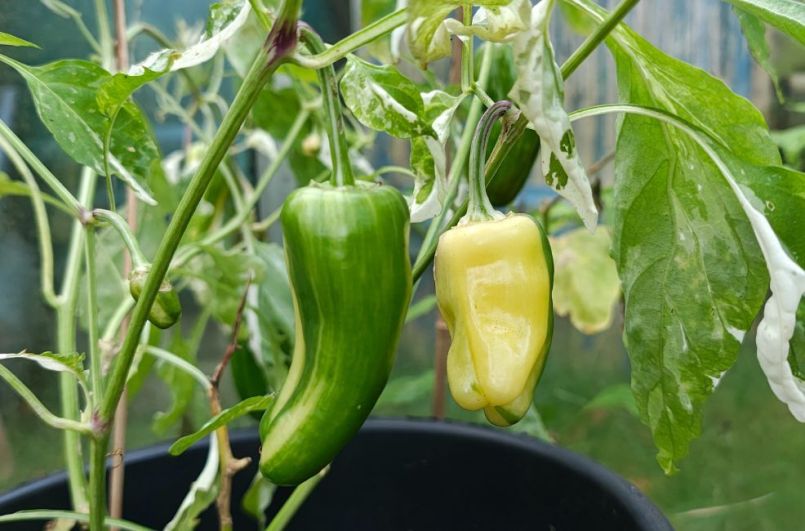 Hier staat er ook nog wel wat buiten. Zou-pi groeit dapper door en in de kas heb ik Candy cane nog met groene vruchten staan. Die doet er nu wel lang over om af te rijpen, helaas. Maar de hele plant was tijdens de slakkenplaag bijna helemaal opgegeten op wat kleine blaadjes na, dus het duurde een hele tijd voor die ging bloeien. Ik wilde er graag wat zaden van ondanks dat het een hybride is, maar dat gaat 'm denk ik niet worden. En her en der ook vooral nog pepers, die houden het echt heel lang vol. Edit: Zou-pi is helemaal geen paprika, maar een peper. Foei, woldistel 🤪