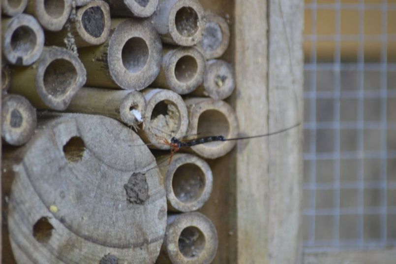 Ik spijker overal van die tuttige huisjes tegen palen en muren. En soms zijn de bijtjes sneller dan ik ze kan ophangen. Dit hokje werd gelijk in gebruik genomen toen het nog binnen in mijn tuinschuurtje stond. En niet teveel nadenken over afmetingen en wel of geen denneappels. Andere insecten komen toch kijken of er iets te halen valt. Deze sluipwesp is dagen bezig geweest met eitjes deponeren in de dichtgemetselde bamboe. Mijn insectenhotel op de volkstuin is inmiddels grotendeels ingestort en overgroeid. Volgend jaar maak ik weer een nieuwe collectie.