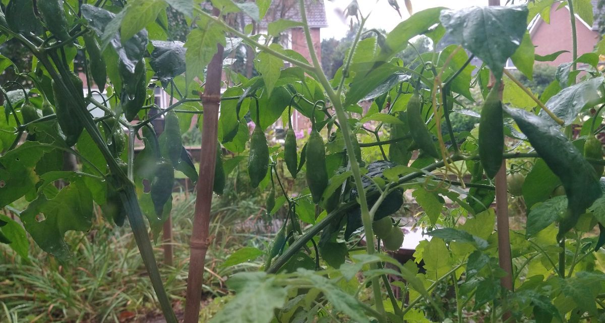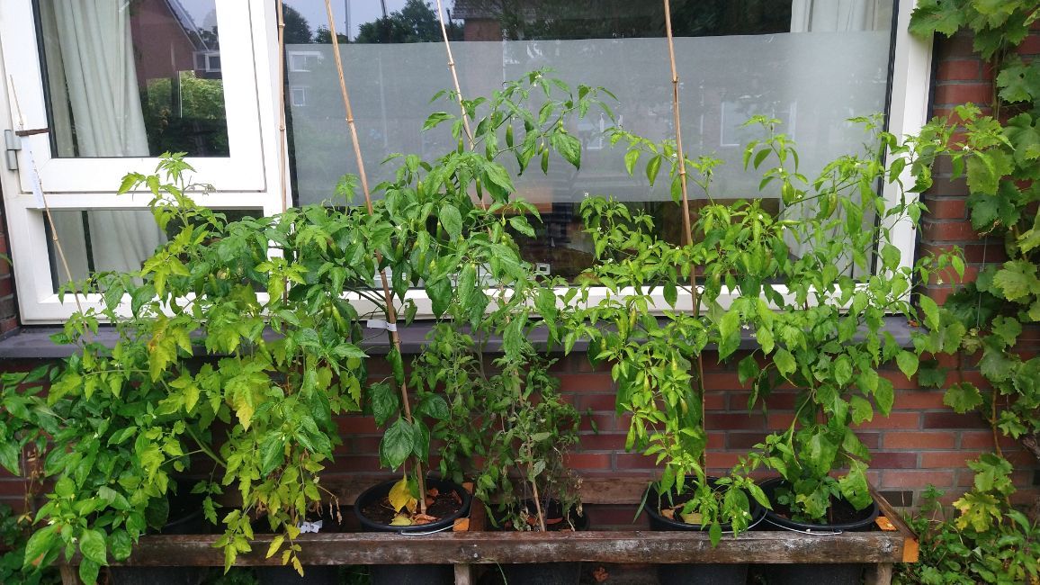 Inmiddels met wat meer pepers ( en twee tomatenplanten). Zicht vanaf binnen op de bank (aji delight 😍)