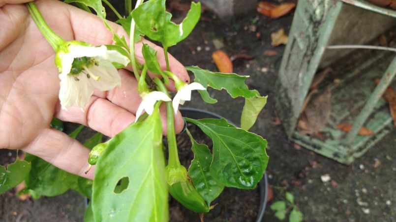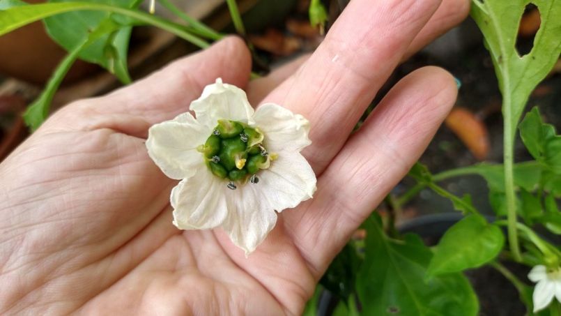 Fasciatie bij een paprika (Georgescu chocolate). Nog niet eerder gezien bij peper/ paprika. Bloem is drie keer zo groot als normaal en het lijkt of alles ook al bevrucht is. Ben benieuwd naar het resultaat. Grote bloem in vergelijking met de normale bloemen. Niet letten op de aangevreten bladeren, hè 😁