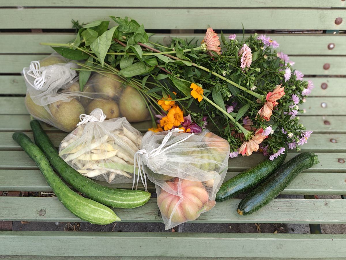 Bloemetjes diversen, tomaten, pepers en komkommers en courgettes en ik heb dit jaar mega peren van de Conference. Ik vind ze echt groot.