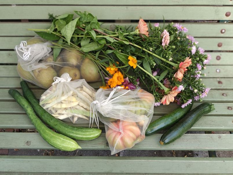 Gras maaien, wieden en snoeien. Op mijn tuin zijn er altijd veel uitlopers van de pruimenboom, dus die maar weer eens weggehaald. Ook de braam bij de ingang tot in de grond afgeknipt. Ik zag dat er een ziekte in zat (eencellige braamroest, volgens de Seek app) en ik had dit jaar ook maar een korte tijd bramen en toen verdroogde de boel of stierf het af. Waarschijnlijk loopt ie wel weer uit, want er komen op meer plaatsen bramen tevoorschijn die ik elk jaar wegknip, maar het volgende jaar staan ze er gewoon weer. Ik heb ook al een vervanger op voorraad (Triple Crown), maar die ga ik dan waarschijnlijk toch op een andere plek zetten. Daarna lekker oogsten. Frambozen, twee hele kleine pompoenen (Golden nugget), komkommer, courgette, Herrenböhnli (blijft maar doorgaan), pepers, tomaten en paprika's en natuurlijk weer een bosje Zinnia's. Die blijven ook maar doorbloeien.