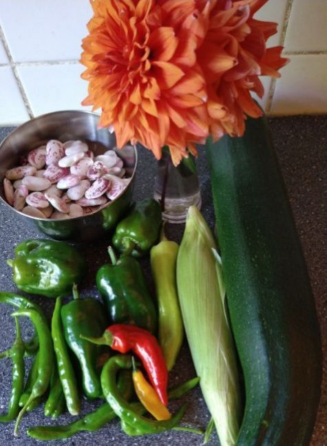 Nog wat van dit en dat. Twee prachtige dahlia's en een hoop limabonen. Ook een grote courgette voor de soep. En de eerste aji pineapple! Blijkbaar rijpen die vanaf de punt tot de steel. Nog niet geproefd, deze eerste is voor het zaad 😁