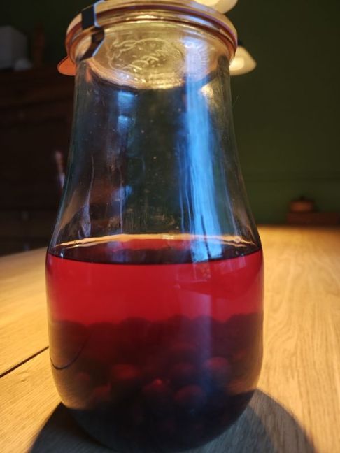 Ik heb sleedoornbessen op wodka gezet. Die vond ik terug in de diepvries. Dit jaar dan ook maar weer nieuwe plukken, ik zag er al behoorlijk wat hangen. Ik gooi de suiker er altijd gelijk bij. Met 37,5% alcohol kan er niet veel mis gaan.