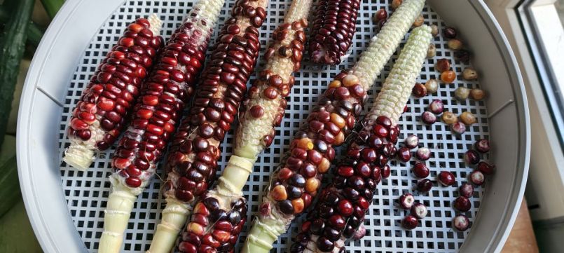 Mijn mais houdt niet over, dit jaar. De dwergmais deed niks, de rode suikermais had ook geen zin en de kolven van de Painted mountain zijn ook maar voor de helft of minder bevrucht. Niettemin heb ik daar dan genoeg voor om volgend jaar een heleboel te zaaien en ook een paar leuke donkerrode maiskolf bladeren overgehouden voor een leuk maispopje met een donkerrood jurkje 😀