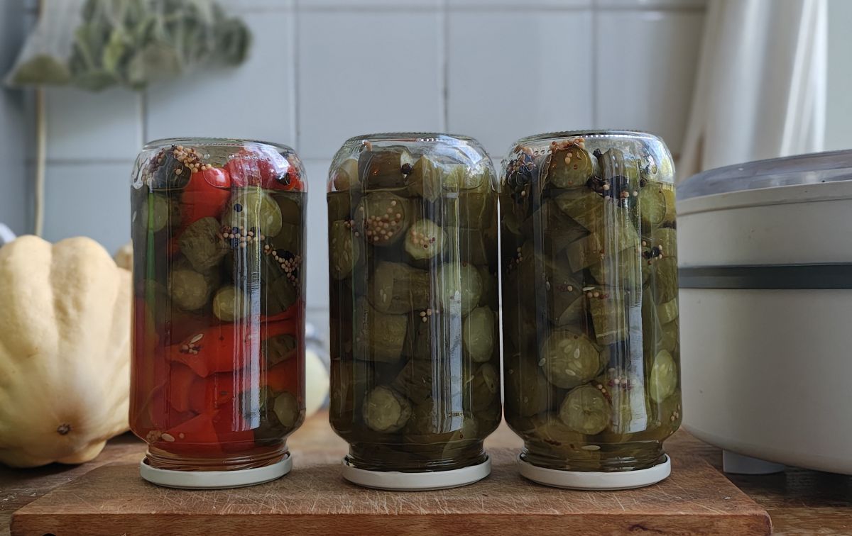 Komkommers in het zuur, spekbonen voor in de diepvries en de voedseldroger is bezig met de laatste tomaten. De courgette en komkommer zitten al in hun pot. Morgen maar weer eens kijken wat er in de droger kan.