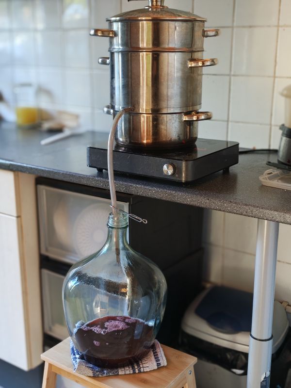 Gestoomde bramen uit de sappan. De diepvries heeft nog wel wat teveel qua fruit. Wij zijn geen jam-eters, dus dan maar wat liters vruchtenwijn. Er gaan straks ook nog vlierbessen en frambozen in de mix.