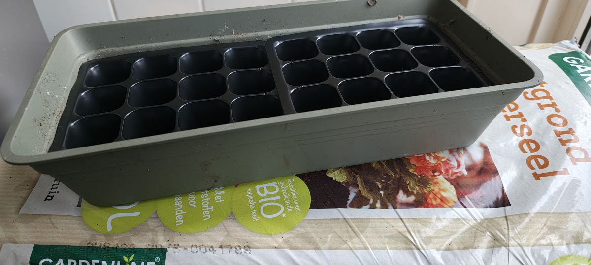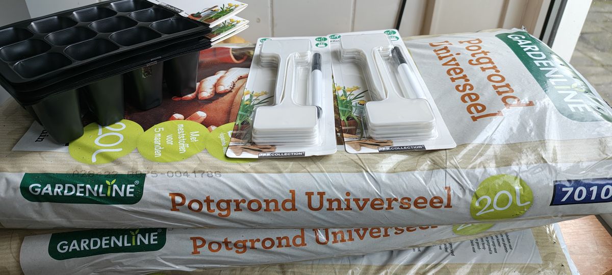 Etiketten, kleine zaai-trays en potgrond, want de pepers moeten verpot. Alles van de Aldi. Vooral die kleine trays zijn fijn, want ze passen precies in de groene Action kweekbak