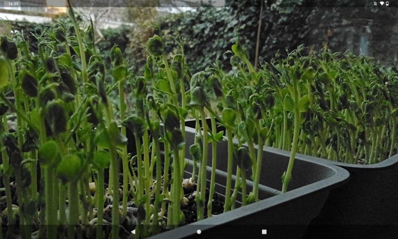 Laat ik maar beginnen dan 😀. Erwten (nachtje geweekt) voor erwtenscheuten gezaaid op 26 december. Dus dit is na 10 dagen. Ik wacht nog even op wat meer blad en dan kan de eerste snee er weer af. Ik ga wat minder diep afsnijden dan de vorige keer, want toen kwamen de scheuten niet erg sterk terug. Dit zijn gewoon gedroogde hele erwten van Ekoplaza, dus wel bio, maar geen idee welke soort.