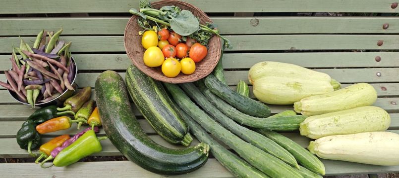Buurvrouw, heb je al komkommers? Jazeker, wil je er een paar? Ik heb ook wel wat courgettes voor je! Nee, dankjewel, ik mag het huis niet meer in, als ik meer dan 4 stuks meeneem! Gelukkig waren er ook nog bonen diversen en tomaten enzo. Morgen de voedseldroger maar weer opstarten