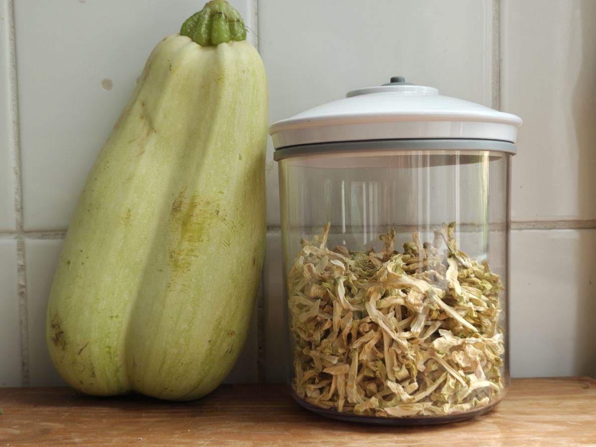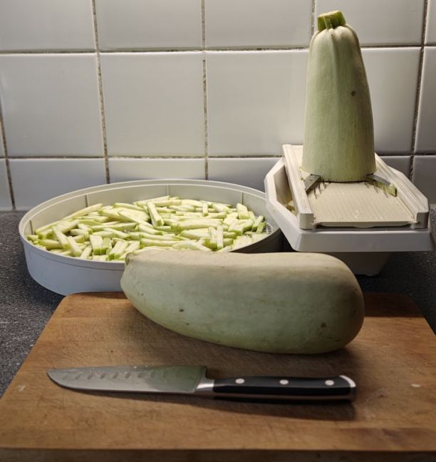Even een foto om dit topic weer omhoog te schoppen. Vandaag vijf of zes courgettes gedroogd. De pruimen op de volkstuin, waar ik zelden iets mee doe, zijn ook rijp. Ik wil er nu toch maar eens wat van drogen.