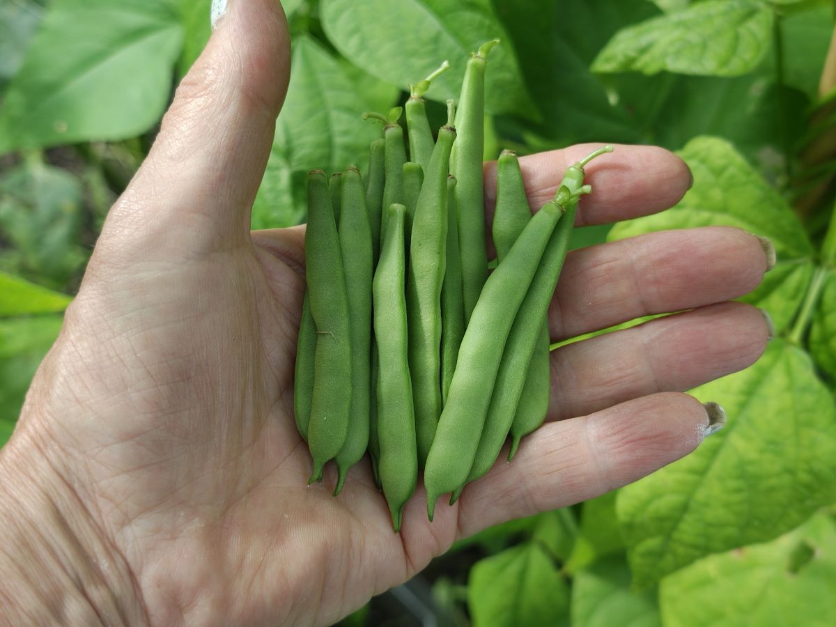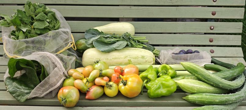 Pruimen voor in de voedseldroger, NZ spinazie, Basella/Poi/Malabar spinazie, weer courgettes, weer komkommers, beetje Piracicabra broccoli, zomerprei, paprika, nog niet rijpe tomaten en het eerste handje Herrenböhnli.