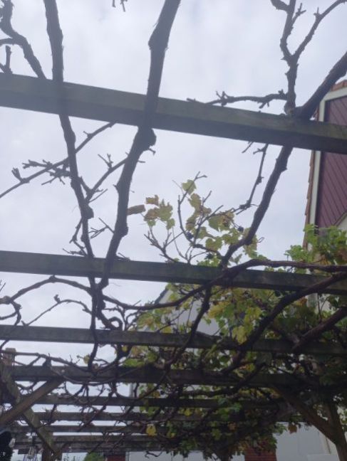 Bij thuiskomst vandaag waren 2 man aan het snoeien, 2/3 van alle takken met blad en verschrompelde druiven waren al weg geknipt.