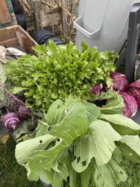 En dan ga je eindelijk weer es wat doen op de tuin, en dan kan je boerenkool, nog drie kleine koolrabi, wat roodlof, snijbiet, andijvie en n een maaltje paksoi oogsten. De laatste moest ik wel delen met beestjes. Leek wel gatenkaas! Dat word om de gaten heen eten! 😊😂😋