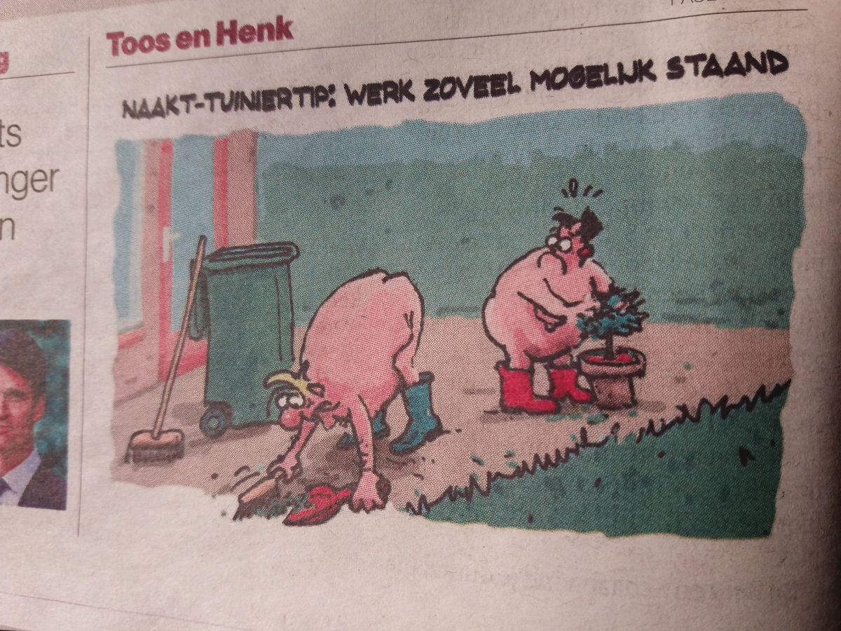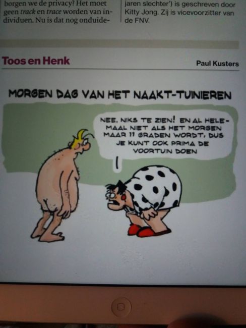 Hahaha.....je hebt gelijk...ik houd ook mijn kleren aan. Ik begrijp ook niet wie dit bedacht heeft. Je zou toch denken dat er niemand aan mee doet? Kreemig, ik weet wat er op ons moestuincomplex zit....wil ze echt niet in hun blote kont zien hoor!- Wat heb je vandaag gekregen?