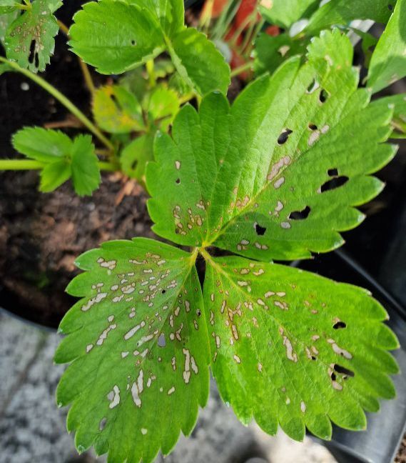De bladeren van sommige aardbeiplanten zitten vol met dit soort vlekken, na enige dagen zijn dit gaten.