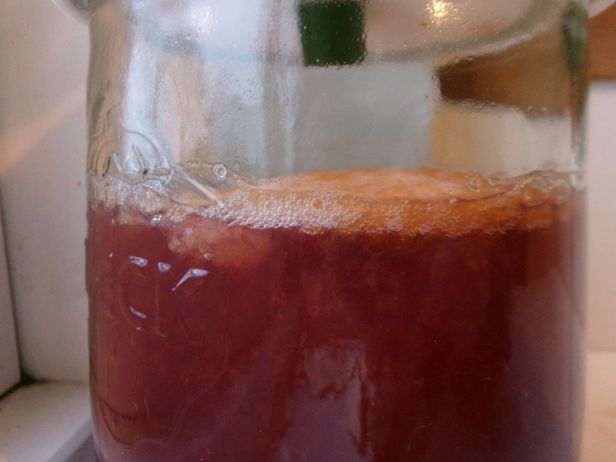 Ik heb net weer een pot met gember en limoen en dadel en nu ook wat sinaasappelschil gezeefd en in een fles gedaan, en een deel van de korrels daarna in 750 ml pruimensap gestopt. Gepasteuriseerd pruimensap, uit fles uit eigen voorraad. Het schuimt (na een dag) al flink!
