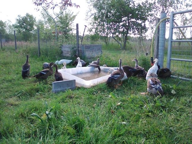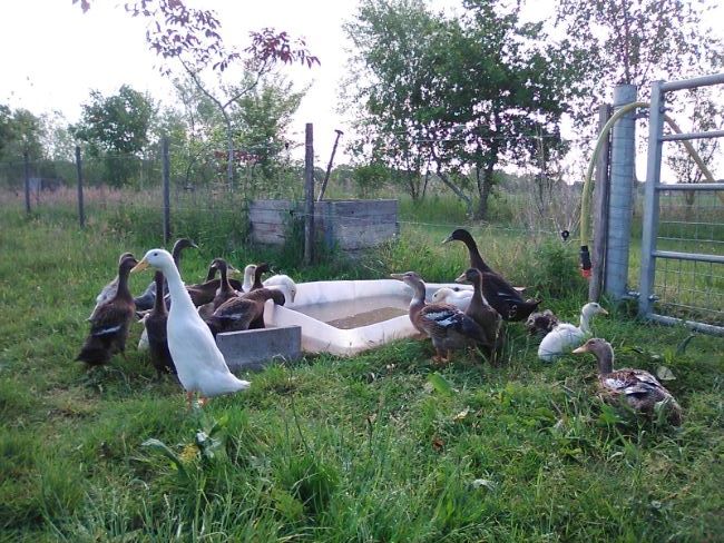De eendjes van april vermaken zich erg goed als ik ze even uitlaat in de wei:- Vleeskippen, snelgroeiend.