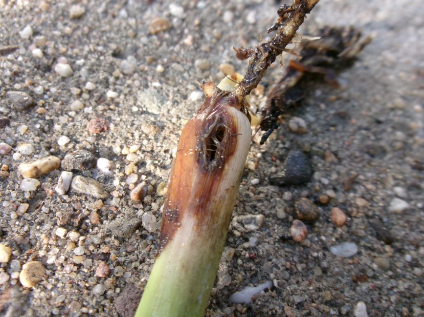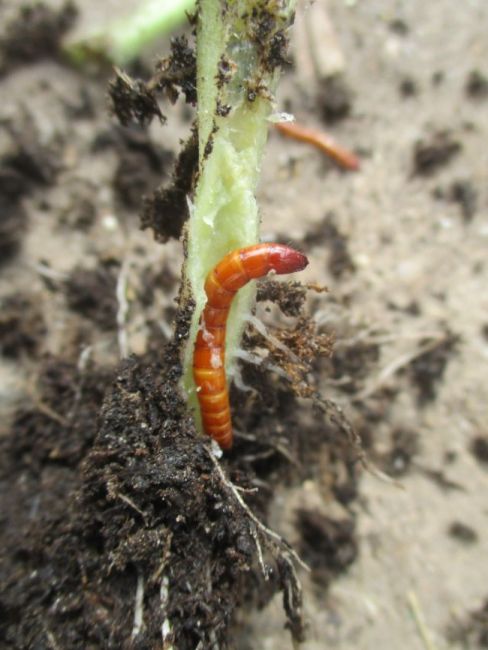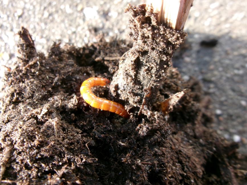 Tja, lekker positief van 2012-mij he Zoveel jaar later heb ik af en toe last van die stomme beesten, het lijken er zelfs meer te worden. Of ik herken de schade beter dan toen in 2012... of ik onderhoud mijn tuin beter dan toen, waardoor er veel minder wuivend onkruid staat wat ze misschien dan dus aten. Vooral in de kas kunnen ze irritant zijn omdat je dan van je zorgvuldig opgekweekte planten ineens wat verliest wat je dan niet meer op tijd bijgezaaid krijgt. Zoals meloen en komkommer en tomaat. Ze zitten dan in/door de stam van de plant, een stukje onder de grond: Tomaat: En vandaag een citroengras: Ondertussen houd ik er rekening mee en zorg ik voor back-up planten om er af en toe 1 te vervangen. En als de planten dan echt aan de groei zijn dan merk ik er niets meer van. Ook plant ik bijv. komkommers en meloenen in potjes zonder bodem zodat de ritnaald er vanaf +/- 5 tot 10 cm diep niet bij kan. Dat lijkt ook wel goed te werken. EN ik leg regelmatig gehalveerde aardappels op de grond, waar ze dan in gaat zitten en daarmee vang ik ze dus. Maar goed... leuk is anders