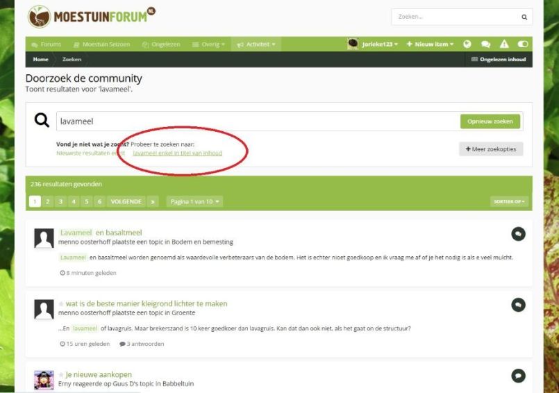 Menno als je hier rechtsboven in het zoekscherm 'lavameel' invult, dan eventueel nog even kiest voor zoeken op het hele forum (kies dan voor 'overal'), en dan óók nog eens klikt op 'lavameel enkel titels' Dan vind je aardig wat topics waar je wat leesvoer hebt en waar je ook nieuwe vragen kunt stellen. www.moestuinforum.nl/search/?q=lavameel&quick=1&updated_after=any&sortby=relevancy&search_in=titles