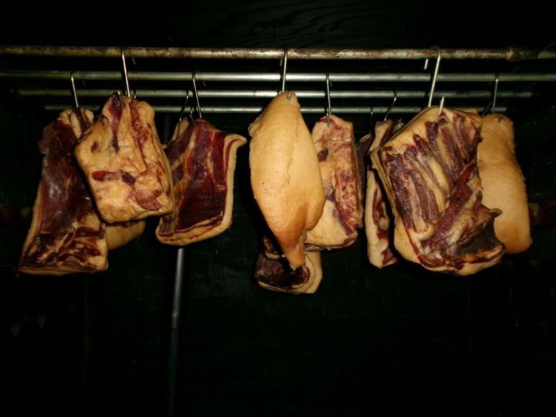 Ja dat is zeker fijn! Morgen ga ik het spek roken, ik heb nu al steeds de dunnere stukken uit het zout gehaald en afgespoeld en in de koelkast gelegd. Alleen de dikke stukken kinnebakspek liggen nu nog in het zout-mengsel. En dan komt mijn moeder donderdag helpen met het verpakken van al dat spek. Ook zit er nog wel wat mooi buikspek bij om plakjes bacon van te snijden. Maar veel van het spek is voor spekblokjes voor door de stamppot en over de salade enzo. Melk&Puur zijn van 1 maart dus over een paar weken zijn ze 1 jaar. Het is even aankijken hoe ze groeien, ik denk dat ze dan nog een vol jaar rond mogen rennen hier, misschien nog wat langer. En dit voorjaar willen we dan inderdaad weer 2 nieuwe biggen. Ik houd Marktplaats in de gaten. We hebben aardig wat verschillende rassen gehad hier. Maar omdat die grotere rassen toch best veel schade aanrichten in een jong bos, hebben we nu alleen nog deze kortneuzige buikschuivers