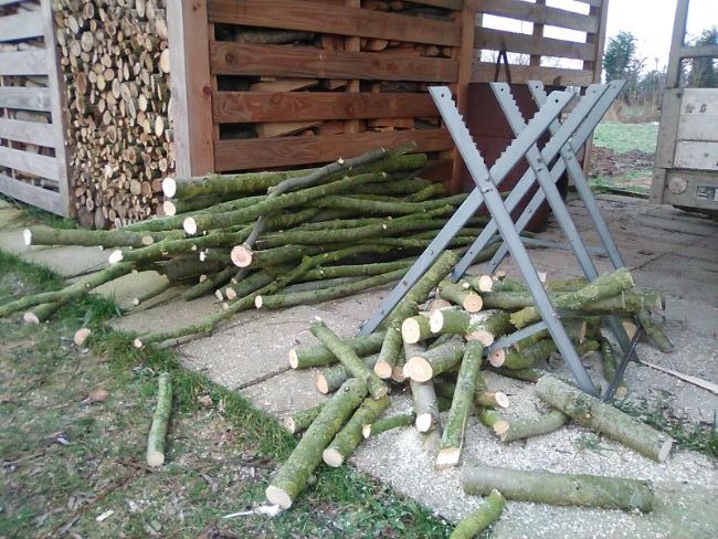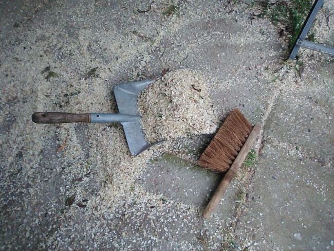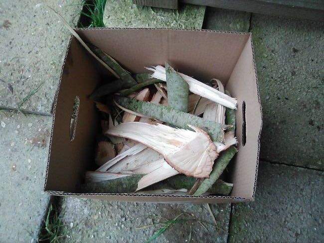 Dunnere takken gaan door de hakselaar of op een stapel tussen de bomen. Ik spaar de 'splinters' en rare eindjes enz. nog op in een doos voor mooi aanmaakmateriaal: En zelfs het zaagsel komt van pas, dat gebruiken we van de lente weer als bodembedekking voor kuikens