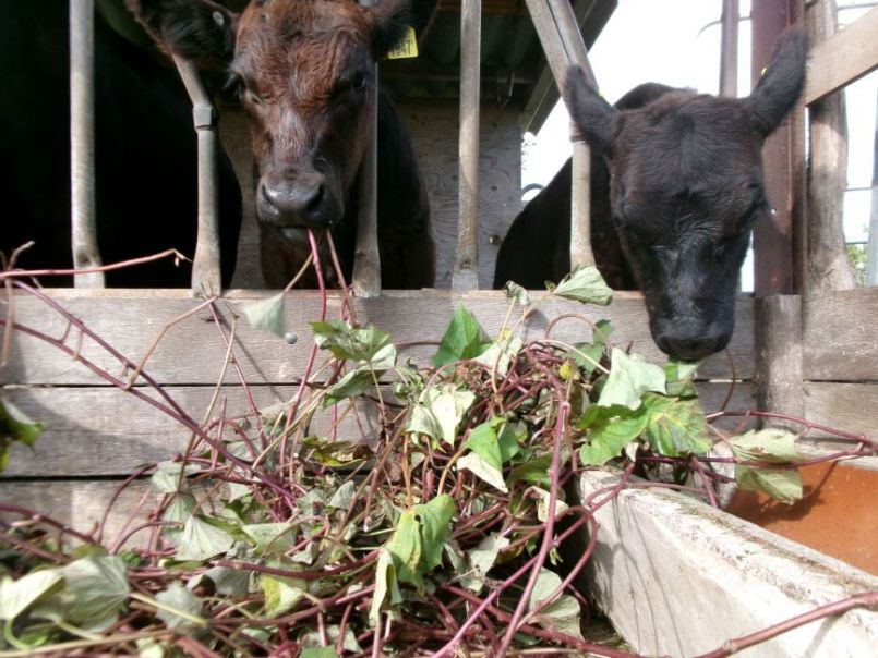 Ze vreten kruiwagens en kruiwagens met zoete-aardappel-loof weg deze week! Ook maaien we veel voor ze, nu het gras in de middag weer even droog genoeg is om überhaupt te kunnen maaien. Er zijn nog best wat stukken met hoog gras op ons terrein, wat nu even lekker kort mag en nog als voer kan dienen.
