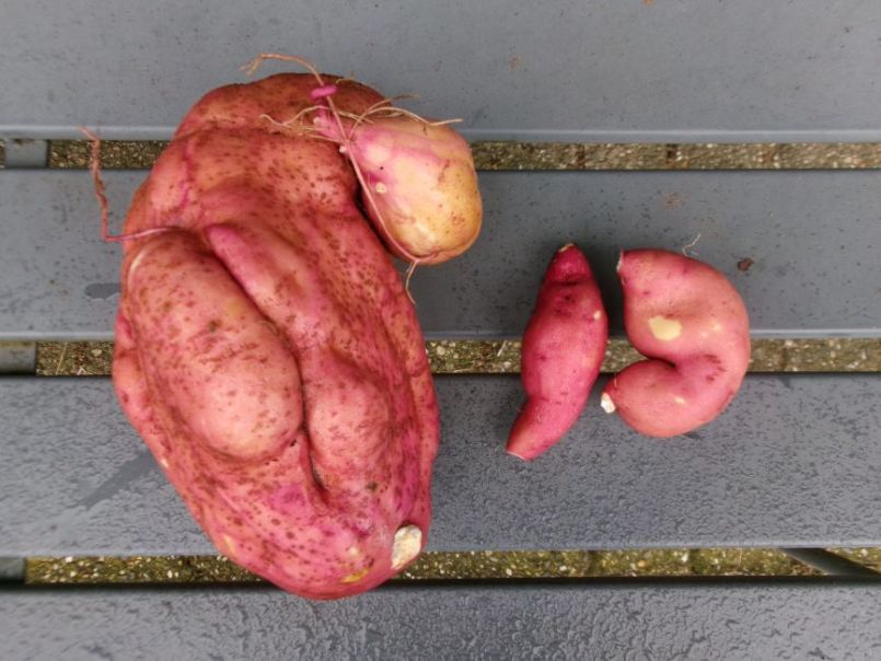 Nog wat zoete aardappels, ondanks dat het eigenlijk te vroeg is om te oogsten hoor! Maar dit ras (Tainung 65) maakt zulke lelijke grote joekels dat ik het wel durfde te gokken. De overige piepers hebben wel een normale vorm