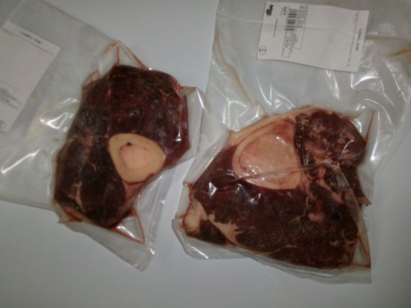 We slachten niet meer zo regelmatig en ook veel minder, dus we hebben eigenlijk geen vlees te koop dit keer. Alhoewel: bij de partij ossenvlees van 2 weken geleden zaten wel heel wat pakjes schenkel. Mooie schijven met lekker wat vlees er aan. Dus heb je met deze koudere dagen al zin gekregen in winterse stoofpotjes en soepen, dan kan je bij ons een eerlijk stukkie vlees kopen Ze kosten zo ergens rond de 4 tot 5 euro per stuk, afhankelijk van hun gewicht (10 euro per kilo). Ik zag ook een enkele van zo'n 300 gram, maar daar zit dan minder vlees en meer bot aan zeg maar. Ze zijn vacuum verpakt en keihard bevroren.