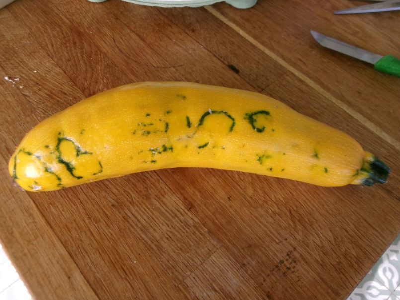 Hm, had ik nou maar wat beter naar het blad gekeken voor ik de hele plant afknipte en bij de varkens gooide... Hij groeide zo enorm op mijn pad en maakte alleen nog dit soort courgettes dus ik vond het wel genoeg geweest. De plant er pal naast doet het nog goed, ik ga hem in de gaten houden.