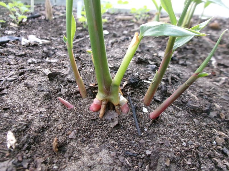 De plantjes maken nog heel dapper wat nieuwe scheuten. Ik heb ze maar wat aangeaard. Ik zag dit voorjaar een kas vol gember en kurkuma voor me...