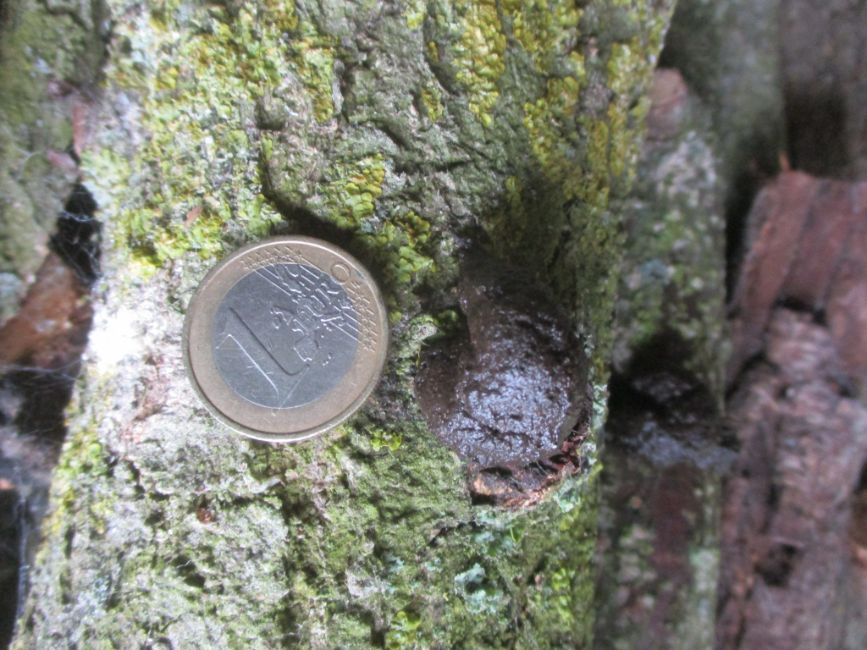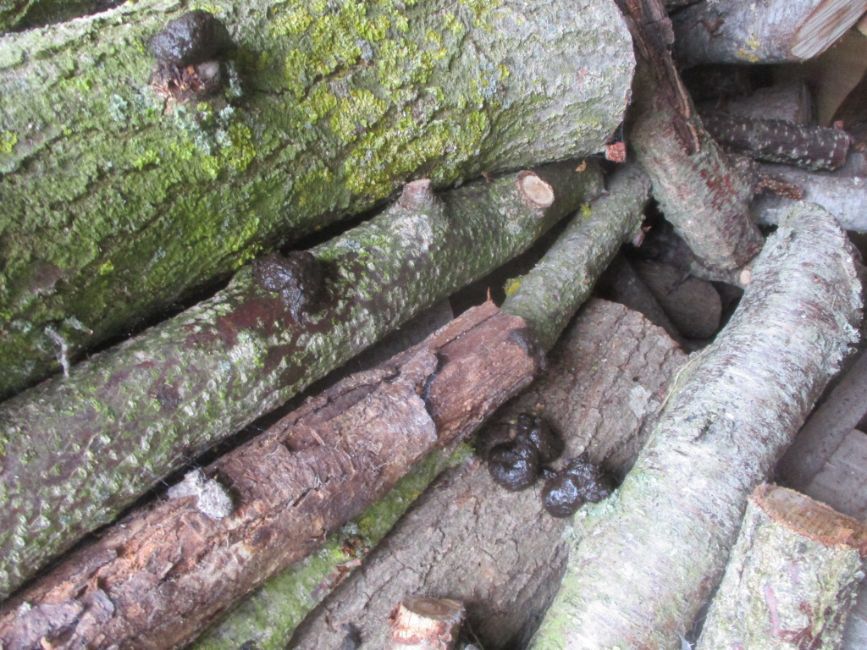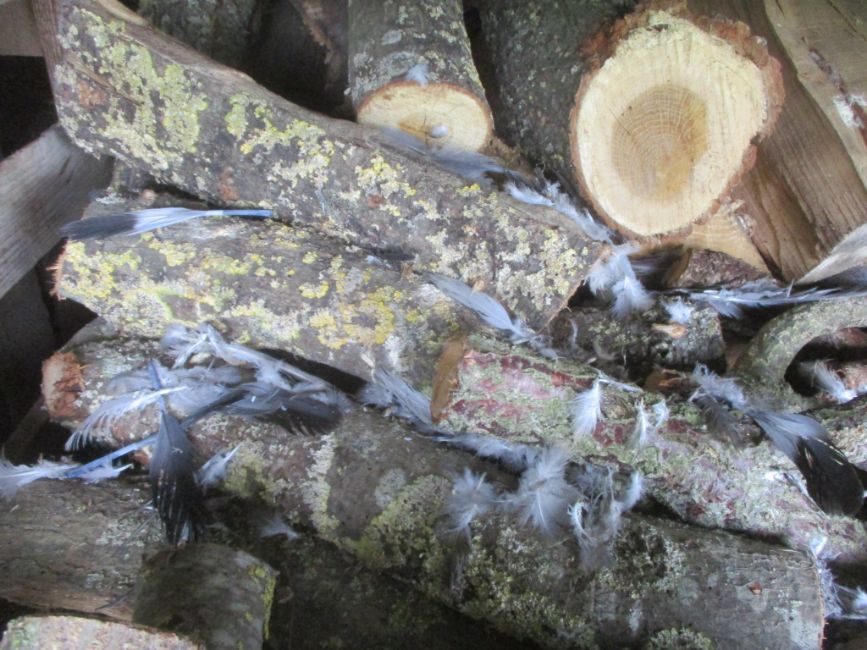 Ik vond deze natte klodders op ons haardhout. Best in het open zeg maar, bovenop. Wie herkent het? Er lig ook al opgedroogde poep, ik denk van hetzelfde dier, waar pitten in zitten. Van fruit. Best groot ook, formaatje kersenpit maar dan plat...? En, ik weet niet of dit met de poep te maken heeft, maar ook precies daar liggen een boel ekster(?)veren.