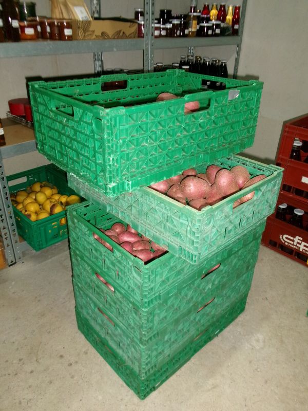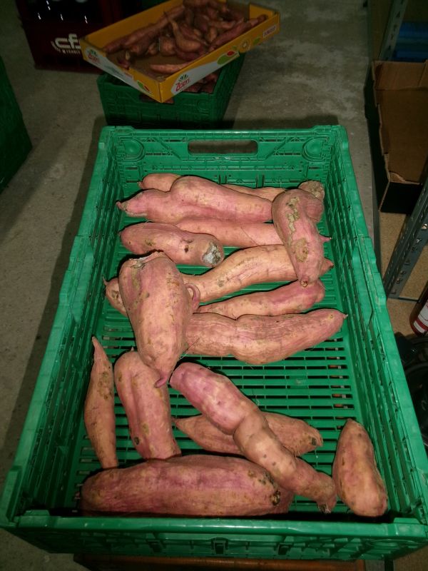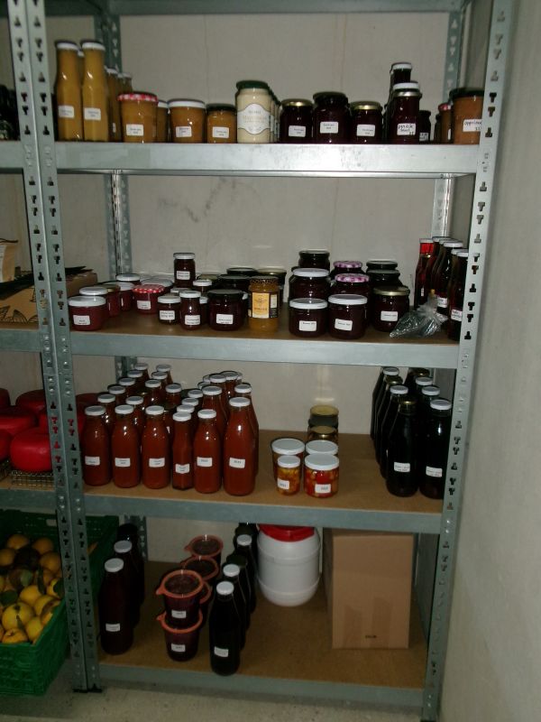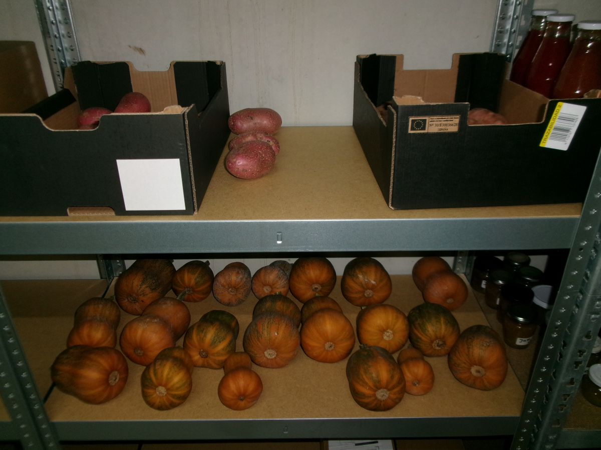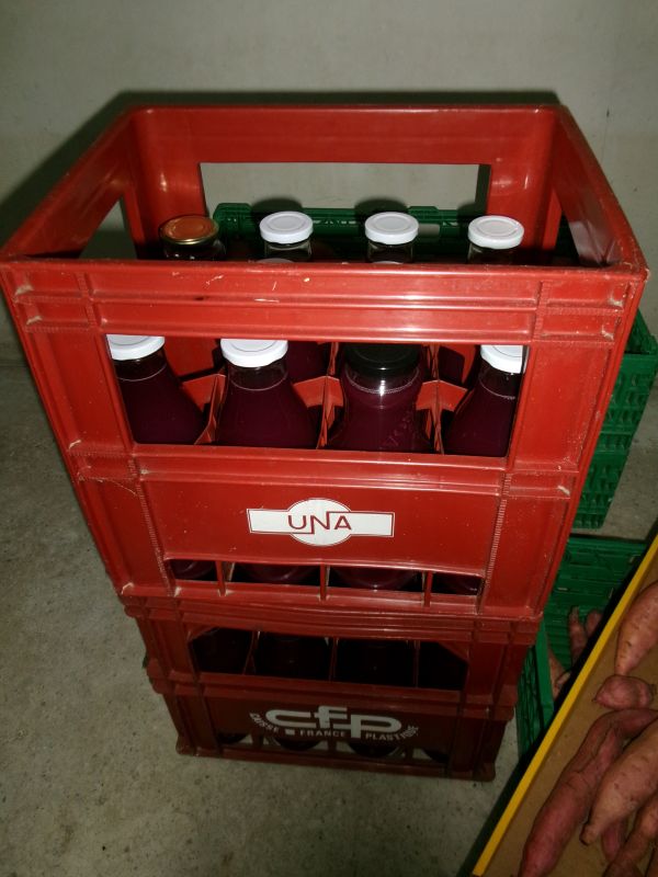 Ik heb heel wat ingemaakt dit jaar! (let even niet op de potjes Fransche mayo, en er staat ook wat honing wat niet van eigen landje komt) Links bovenin veel perkelsaus en perkeljam, rechts bovenin jam en saus van paarsrode perziken. Op de plank daaronder nog meer jammetjes van nog meer perziken en ook wat gemengd fruit (met blauwe bessen van @Arja en wat restjes pruimen en aardbeien). Plus hele kleine potjes hartige pruimensaus. EN potten met bramenprut, om later nog crumbles mee te maken enzo. Op het schap dáár weer onder zie je veel flessen passata. En een aantal potjes zoetzure biquinho-pepertjes. En helemaal rechts nog wat flessen braam-pruimensap. Op de onderste plank nog wat flessen sap (braam+pruim+druif) en potten rode kool. Deze flessen druivensap staan er nog naast En dan staan er nog wat kratten met aardappels, en zoete aardappels, En in een aparte stelling nog wat pompoentjes en de beschadigde aardappels die als eerste op moeten