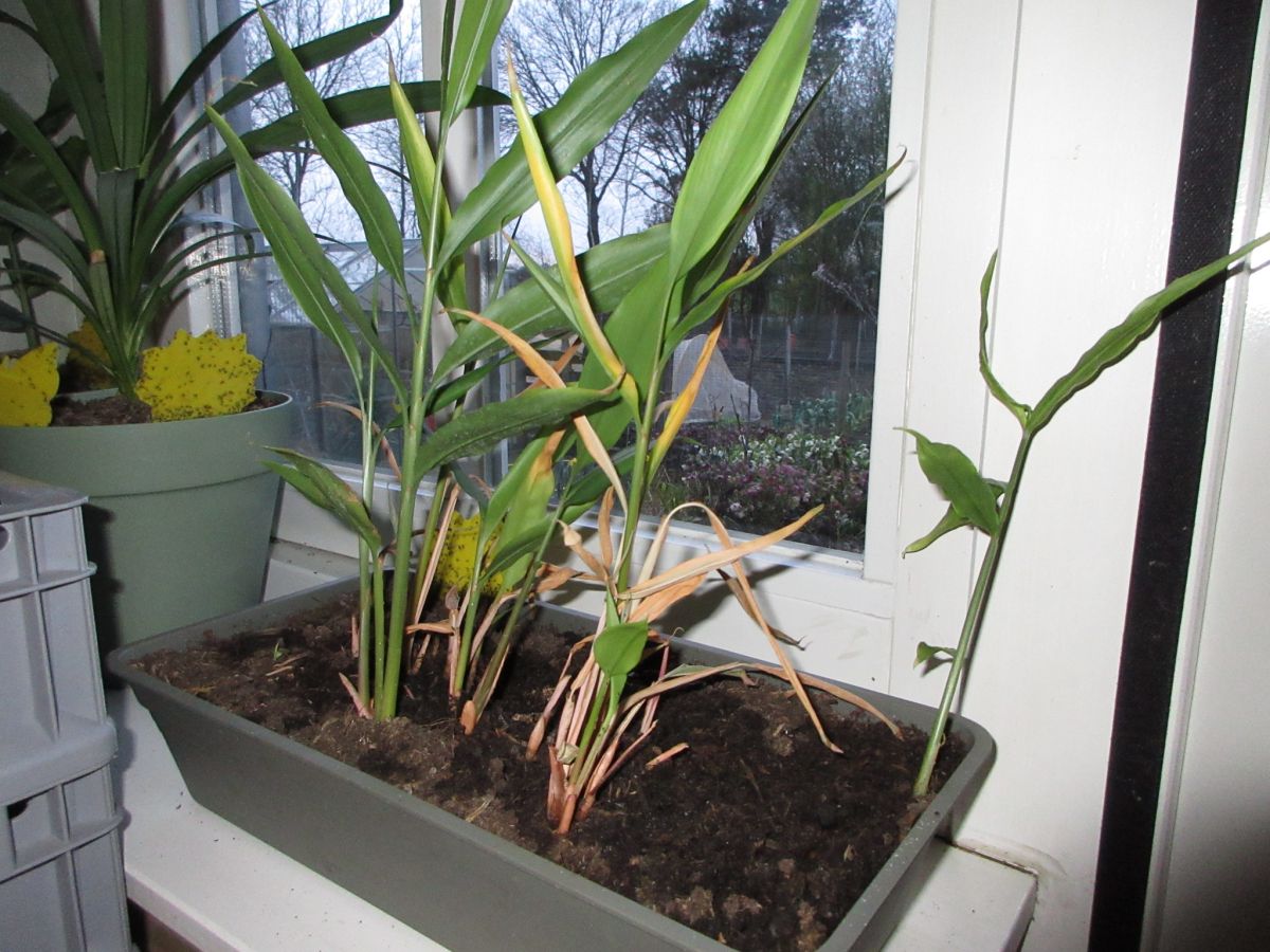Ik heb de planten die eind van het seizoen nog groen waren opgepot en binnen gezet. Daar zijn ze wat loof verloren maar er is ook best wat groen gebleven en nu loopt er her en der weer wat uit. Ik oogstte wat hele kleine gemberwortels en die heb ik in potgrond in de schuur gehad de hele winter. Af en toe een klein scheutje water er bij tegen te erg uitdrogen. En ik heb al wat zitten voelen en die lijken nog wel mooi.