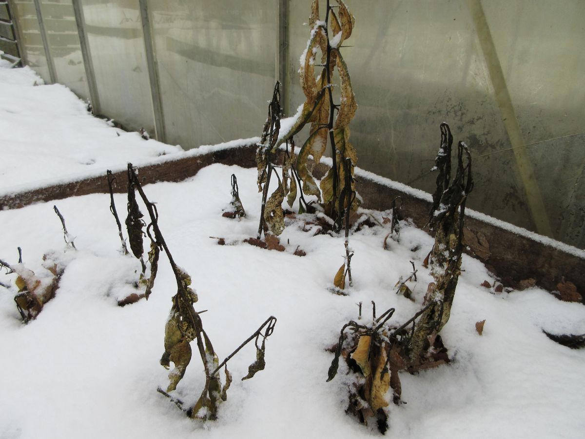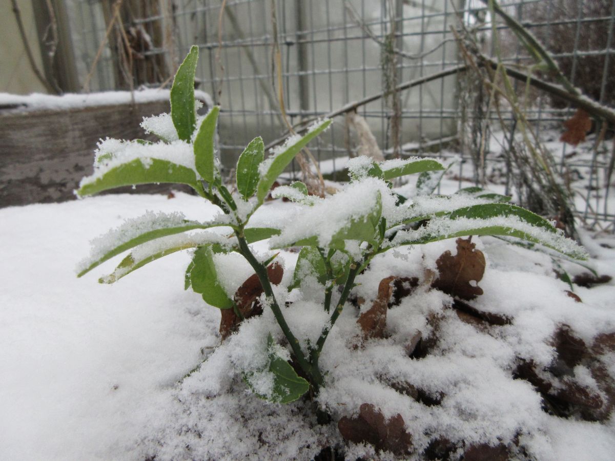 2. Ik heb zaailingen (zelf gezaaid, pitten uit gekochte vruchten) staan, in de vollegrond in de moestuin, die ik met dit weer wat bescherming heb gegeven van een laag eikenblad. Al bedekt dat bij lange na niet de hele plant. Ze kwamen begin 2024 boven de grond, en de vorige winter mochten ze in de kas overwinteren. Ze staan redelijk beschut achter de kas. En je ziet wel duidelijk verschil tussen de soorten: deze vinden het duidelijk niet leuk. Onder het eikenblad zijn ze nog wel groenig.