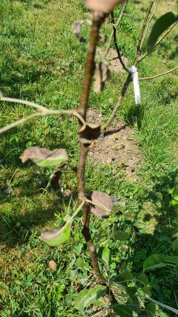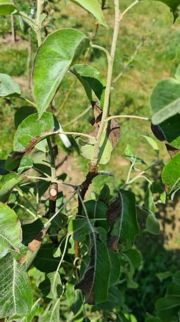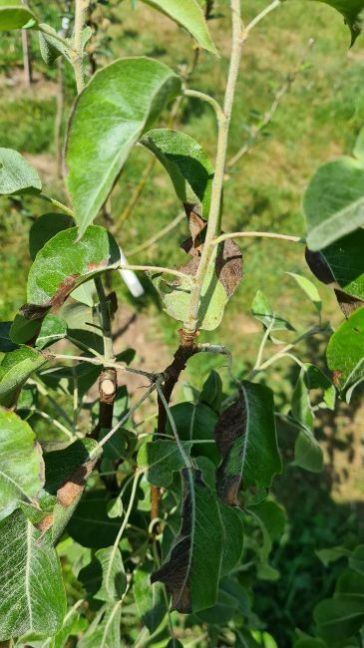 Opvallend dat je al de 2e bent die droogte als potentiële oorzaak aangeeft. Dat zou erg goed nieuws zijn, want dat is relatief eenvoudig te behandelen (zolang de voorraad in de regenwaterput strekt). Ik vreesde vooral voor bacterievuur, maar jullie herkennen dat er niet in neem ik aan? https://www.plantenplagen.nl/plantenplagen/bacterievuur/
