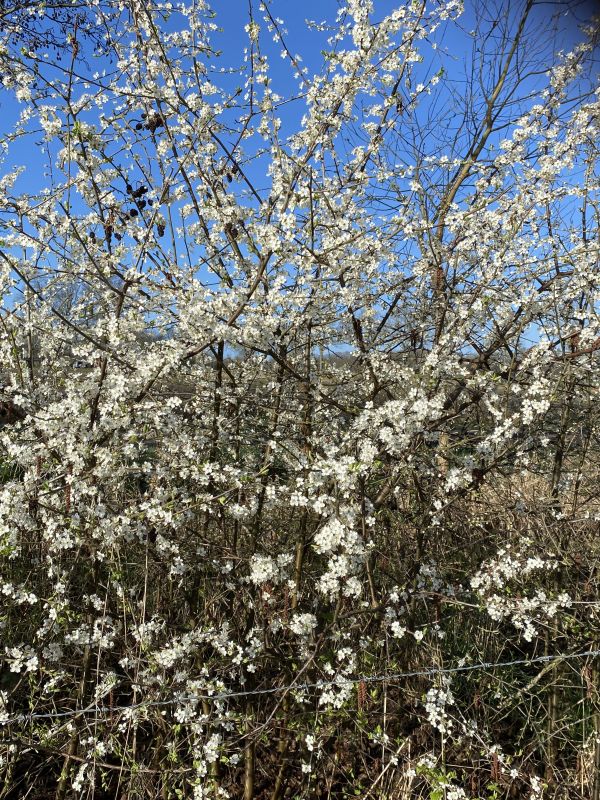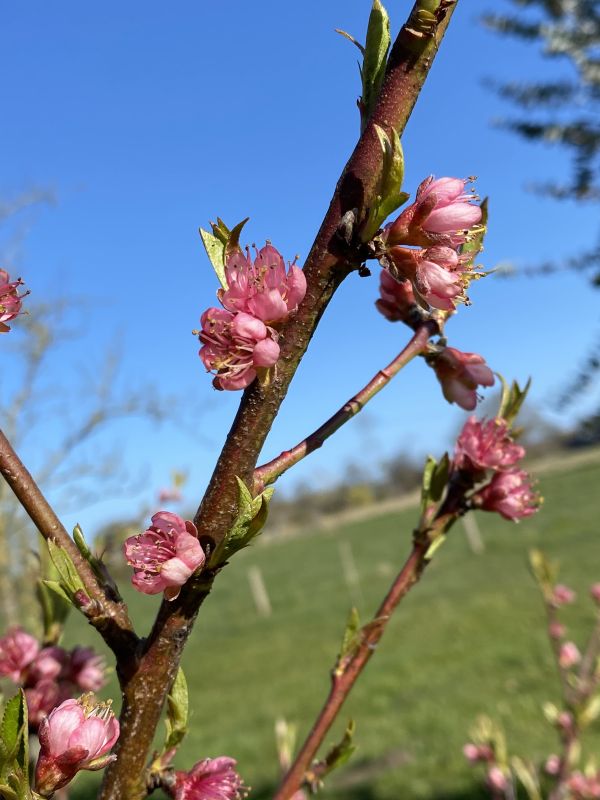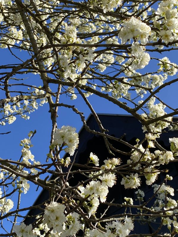 De kers staat in bloei en de kast is uitgebreid met de honingkamer. Daarnaast een vreemde bij in de wei.