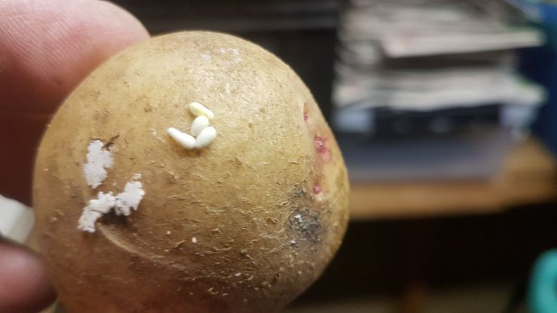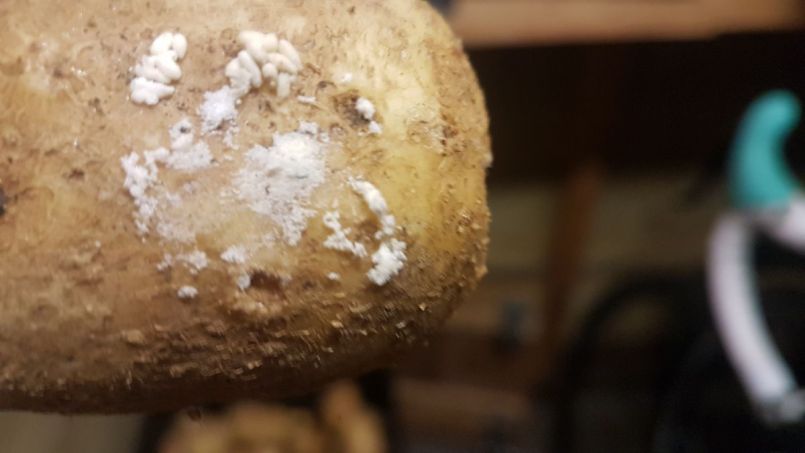 8. Ik heb mijn aardappels (ras Carolus) opgeslagen in plastic kratten in een houten schuurtje. Nu viel mij vandaag op dat veel aardappels witte korreltjes op de schil hebben. De korreltjes zijn iets langwerpig, maar vrij bros, zijn makkelijk plat te drukken en ze laten ook heel makkelijk los. Heeft iemand een idee wat dit kan zijn? De aardappels zelf zijn verder gezond en mooi droog.