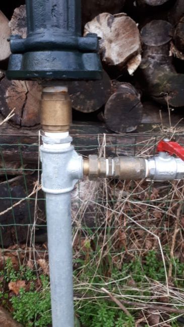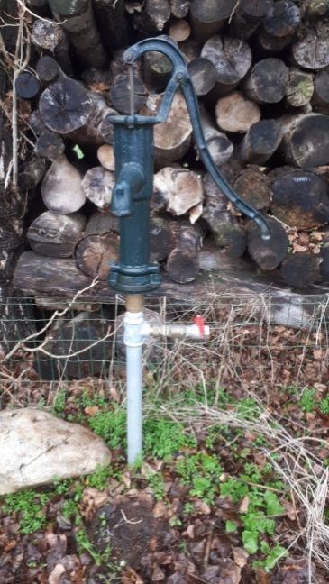 Ja, dan ga je erg blij worden van de T-constructie 😅. Nu even geen foto, maar ik kan wel een preciezere beschrijving geven. Ondergronds een 'gewone' bron en dan komt er een stalen buis uit de bodem, recht omhoog. Op knie-hoogte zit een T-stuk, 90 graden gedraaid in het verticale vlak. Dus de 'ligger' van de T is verticaal geplaatst en de '|' van de T is horizontaal. Op dat horizontale deel zit een kogelkraan en daarna de koppeling voor de waterpomp. Boven de ligger van de T is de zwengelpomp gemonteerd. Foto komt nog. Ties heeft het uitgedacht en gerealiseerd, alle eer voor hem 👌