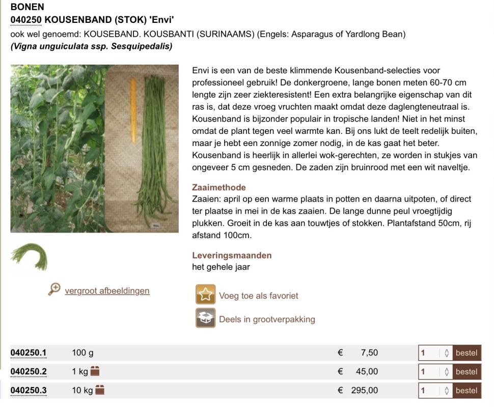 Ik kwam bij Vreeken deze nieuwe kousenband tegen, eigenlijk voor professionele teelt. Mijn vorige poging mislukte vanwege mozaiekvirussen in de grond - daar zou deze geen last van moeten hebben. Maar wat moet ik in hemelsnaam met 100g bonen (normale zakjes zijn 10g). Zijn er mensen die naar de MTFD komen, die interesse hebben om dit samen aan te schaffen?