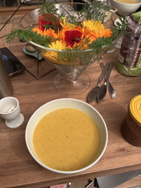 Vandaag pompoen-paprikasoep! Met een flespompoen, een solor pompoen (oranje), de kleine zoete aardappelwortels, een grote gele en wat kleine groene en rode paprika’s, en enkele gewone wortels, alles uet. Gekruid met van alles en nog wat, op smaak gebracht met de gele sambal ook van onze eigen pepertjes. En dan nog chutney en kweepeergelei op de crackers. Gaat goeoeoeoed! Ps de bloemen op de achtergrond zijn ook uet. Met wortelloof als ‘groen’.