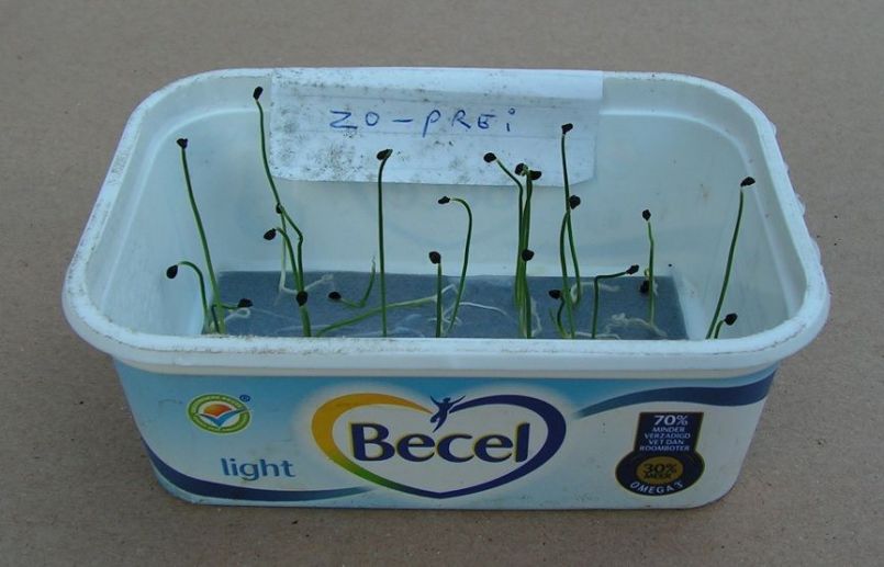 Van Sjeftuintips, tip 18 en tip 4. Prei groeit langzaam. Zaai in januari/februari binnenshuis op vochtig wc-papier. Als 5 cm hoog, plant preitjes in tuingrond onder een kap in een koude kas. Zie tip 18. Laat prei groot groeien en plant ze uit in de tuingrond. Bind op 1 september de bladeren van de prei bij elkaar (met stripjes) en knip de bladeren kort. Tot 1 december telkens de lang gegroeide bladeren kortknippen. De preimineervlieg legt geen eitjes op deze vertikale preibladeren. Zie tip 4. Sjef