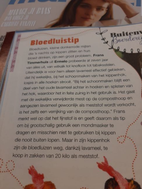 Dank voor de tips @Trea! Ik strooi al een tijdje lavameel op de vloer en in de hoeken van het hok. Ik las die tip in Landleven (? niet meer helemaal zeker) en bij het schoonmaken gaat het mee in de composthoop dus zo komt het ook weer in de moestuin. Ik vond dat wel een mooi dubbeldoel dus ben dat gaan doen. De zaklamptip ga ik ook nog doen. Het testrolletje had vandaag geen luizen dus misschien was het dat dan ook niet. De kip is ook weer flink opgeknapt, scharrelt weer mee en als ik niet had geweten dat ze ziek was had ik niks meer gemerkt. En er was weer een ei gisteren! Wel van de wyandotte, maar toch, de dip lijkt voorbij!