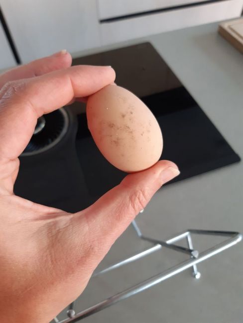 Het eerste ei!! En nog helemaal heel ook, gewoon op de koude grond buiten. Legnest snappen ze niet 🤔