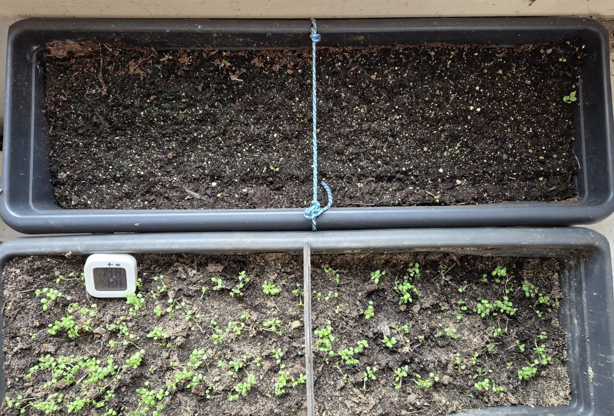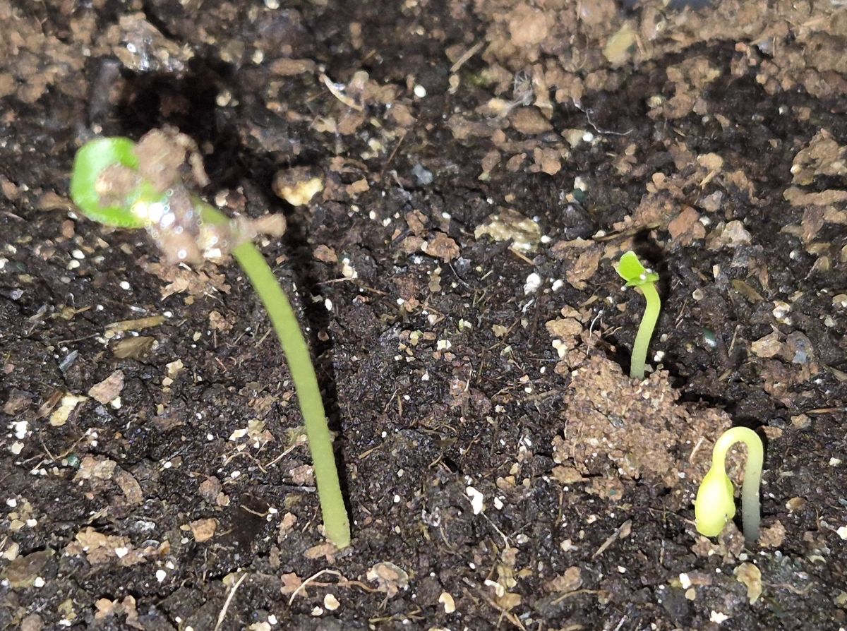 Mijn op 1 november 2025 gezaaide Szechuan. Begin april heb ik de zaaibak binnengehaald, om ze wakker te maken. En nu, na ongeveer 160 dagen, komt er wat op: Nu drie van de dertig, maar er zullen er nog wel meer opkomen (?) Deze luie zaaimethode heb ik eerder succesvol toegepast op Gele lis. ná eerdere ingewikkelde, maar mislukte pogingen (in de koelkast, uit de koelkast, dat 3 à 4 herhalen). Daarom heb ik naast de Szechuan de Gele lis laten meelopen, ook 30 stuks. Als blanco. Geinig om te zien dat die Gele lis ook precies nu weer opkomt.